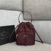 广州白云皮具批发 Prada普拉达81166酒红色原厂尼龙布抽绳手提水桶包22.5CM