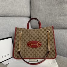 古奇包包货源 Gucci新款老花帆布拼红色牛皮马衔扣单肩包购物袋38CM