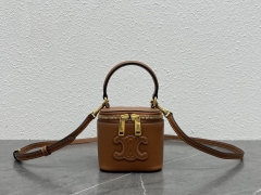 【P980】Celine包包货源 思琳浮雕Logo手提圆筒化妆包斜挎包 100766棕色